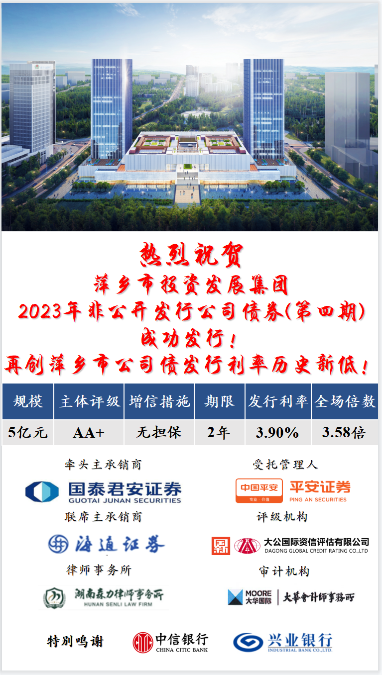 11月30日,萍乡市投发集团2023年面向专业投资者非公开发行公司债券(第四期)成功发行。本期债券发行规模5亿元,期限2年,发行利率3.9%,全场认购倍数3.58倍,再创萍乡市公司债发行利率历史新低。